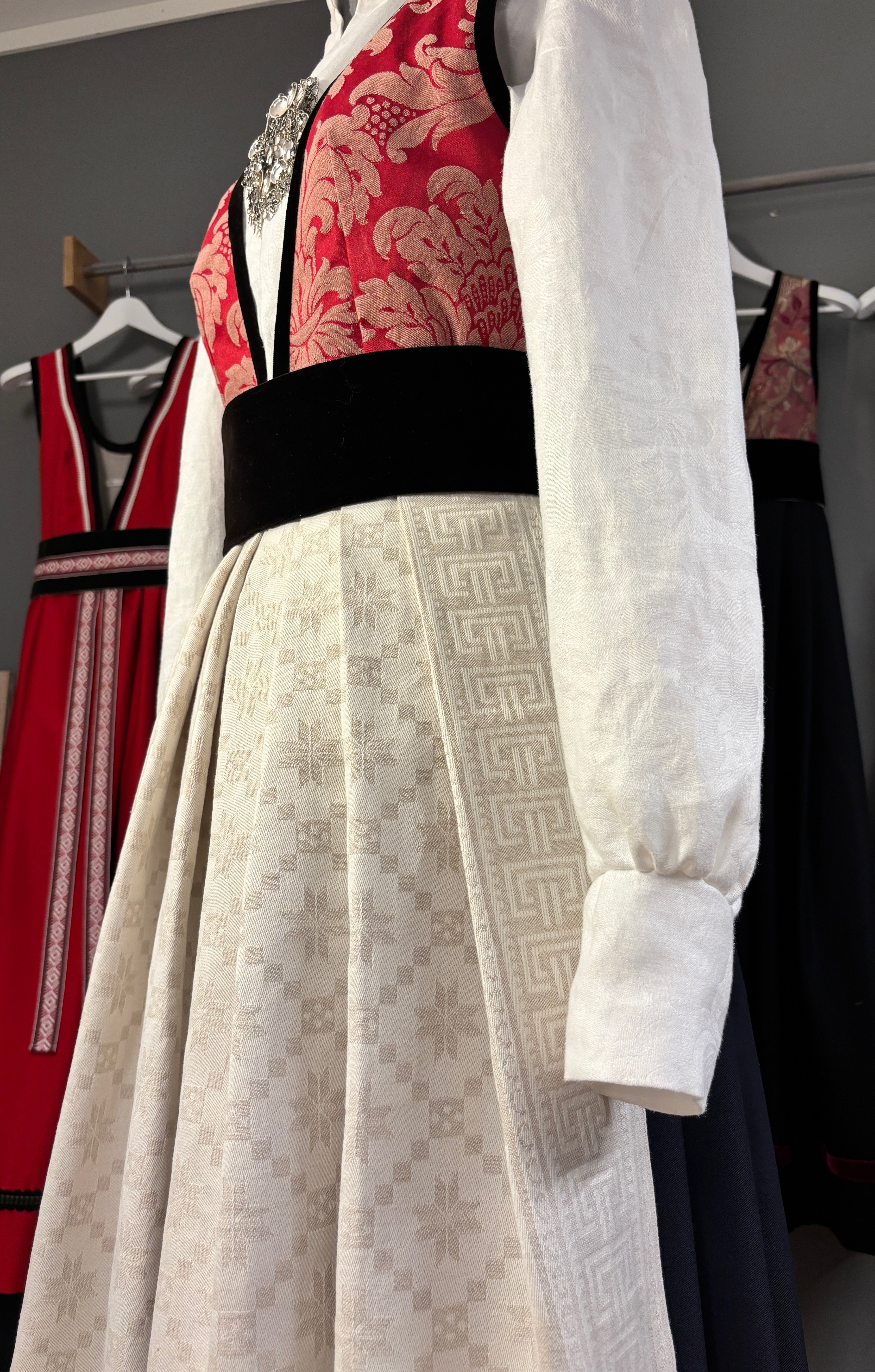 Festdraktene sys etter dine mål som gjør at festdrakten sitter akkurat slik den skal – og med de detaljene du synes er viktig for akkurat din festdrakt. Dette gir deg den samme følelsen av håndverket du får i en bunad, men med større fleksibilitet.