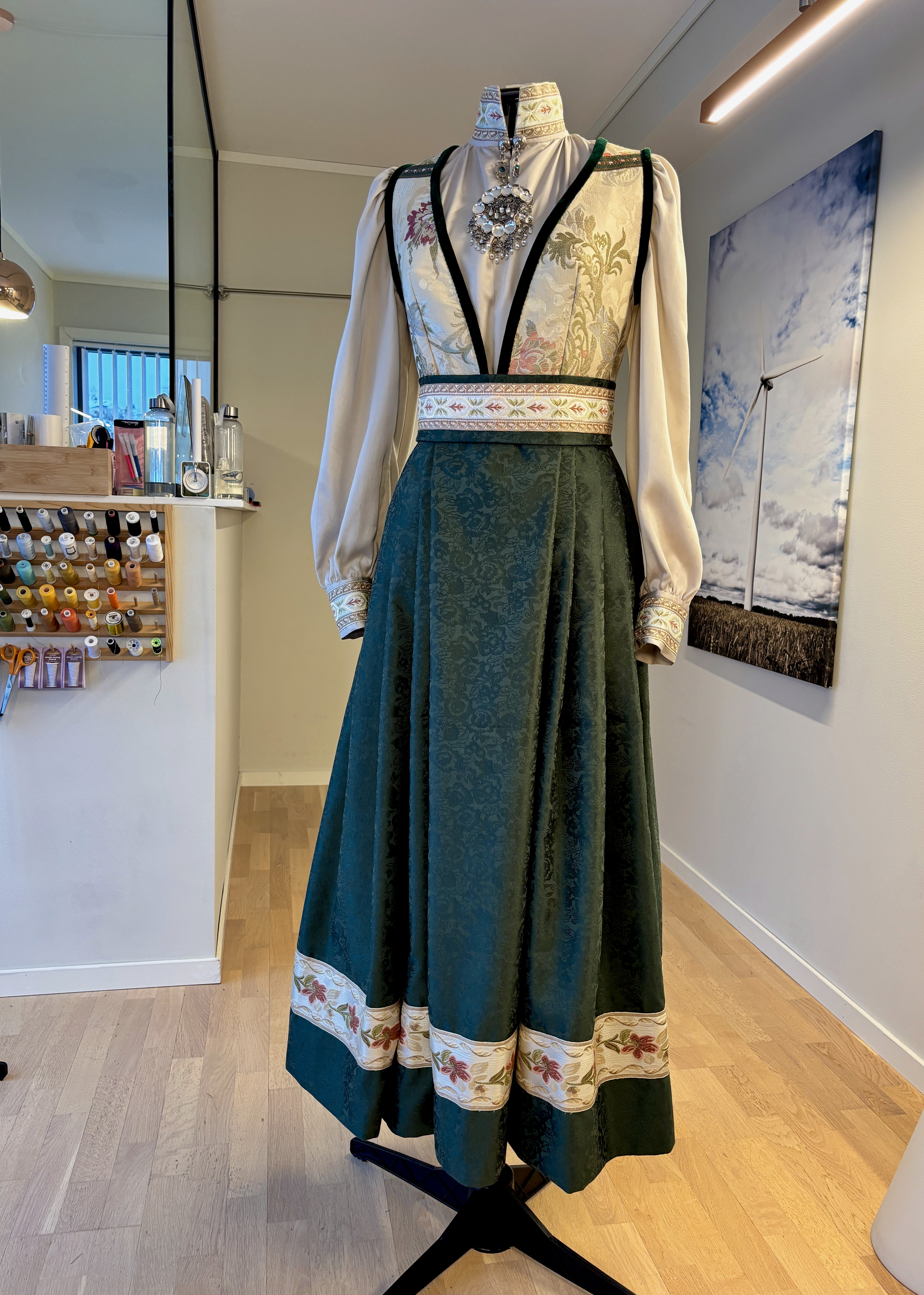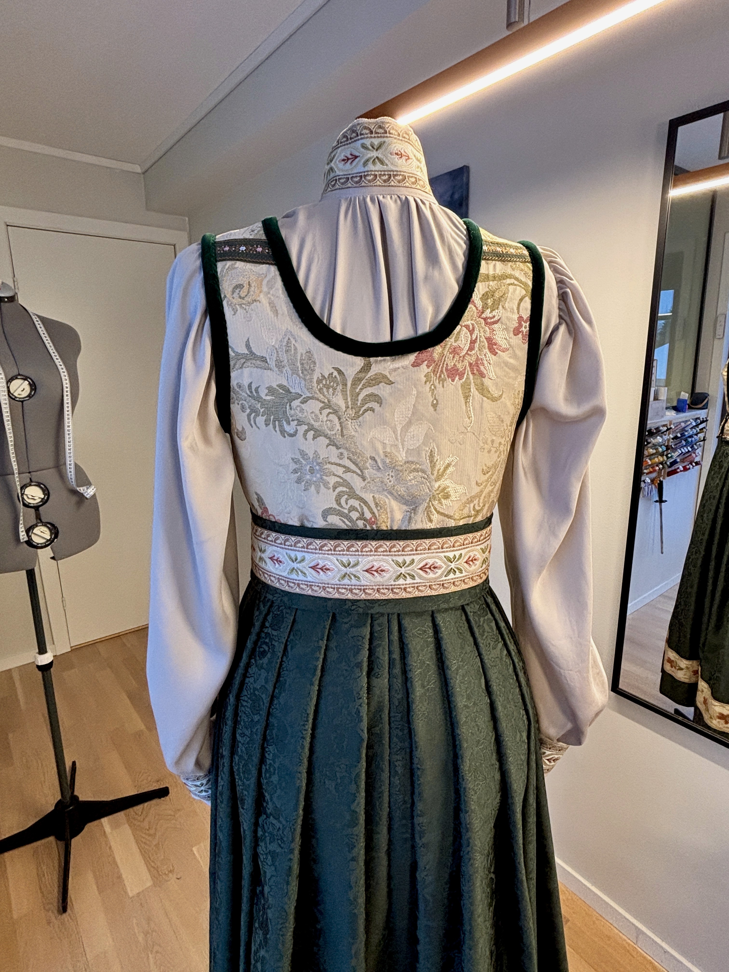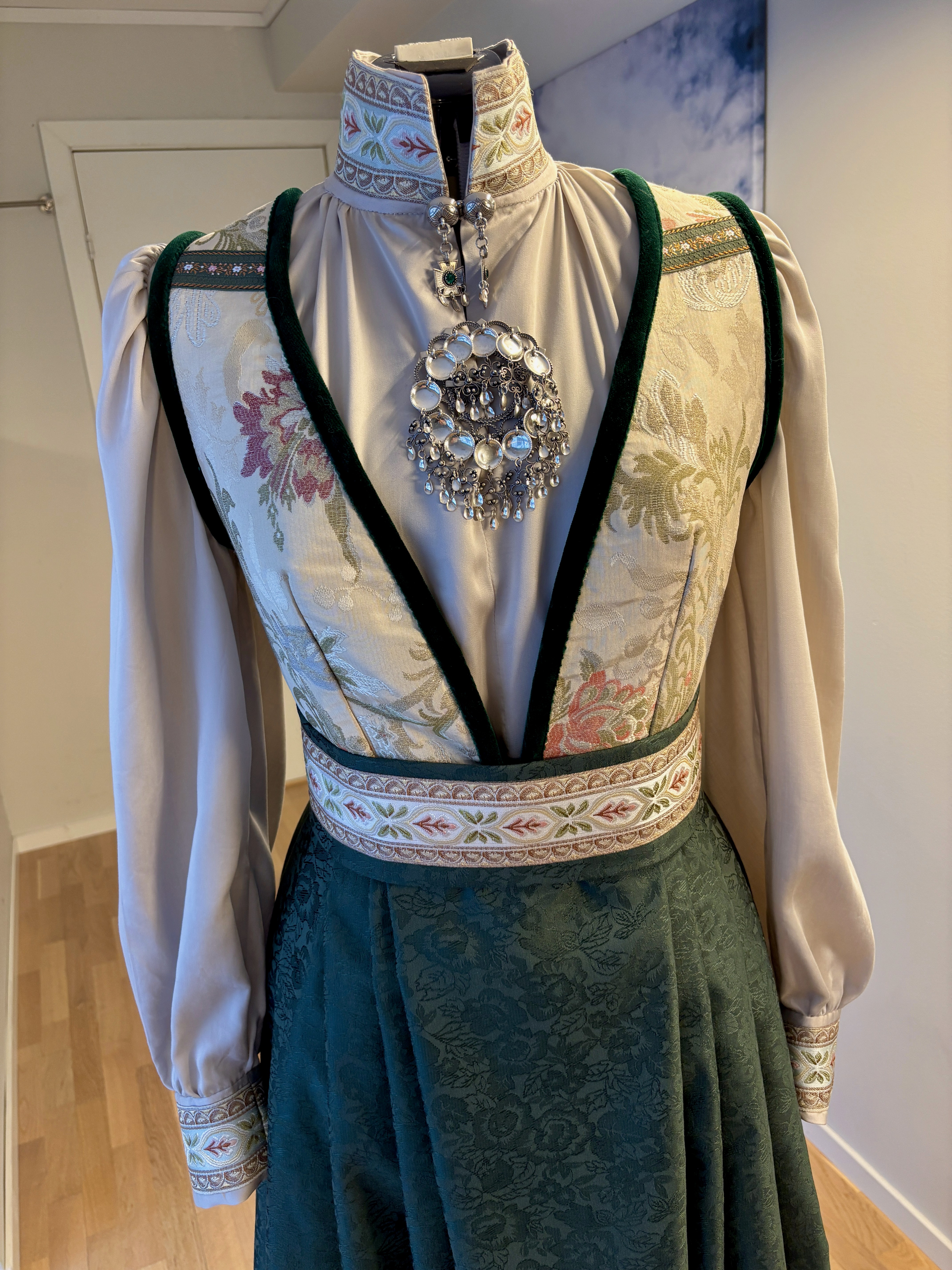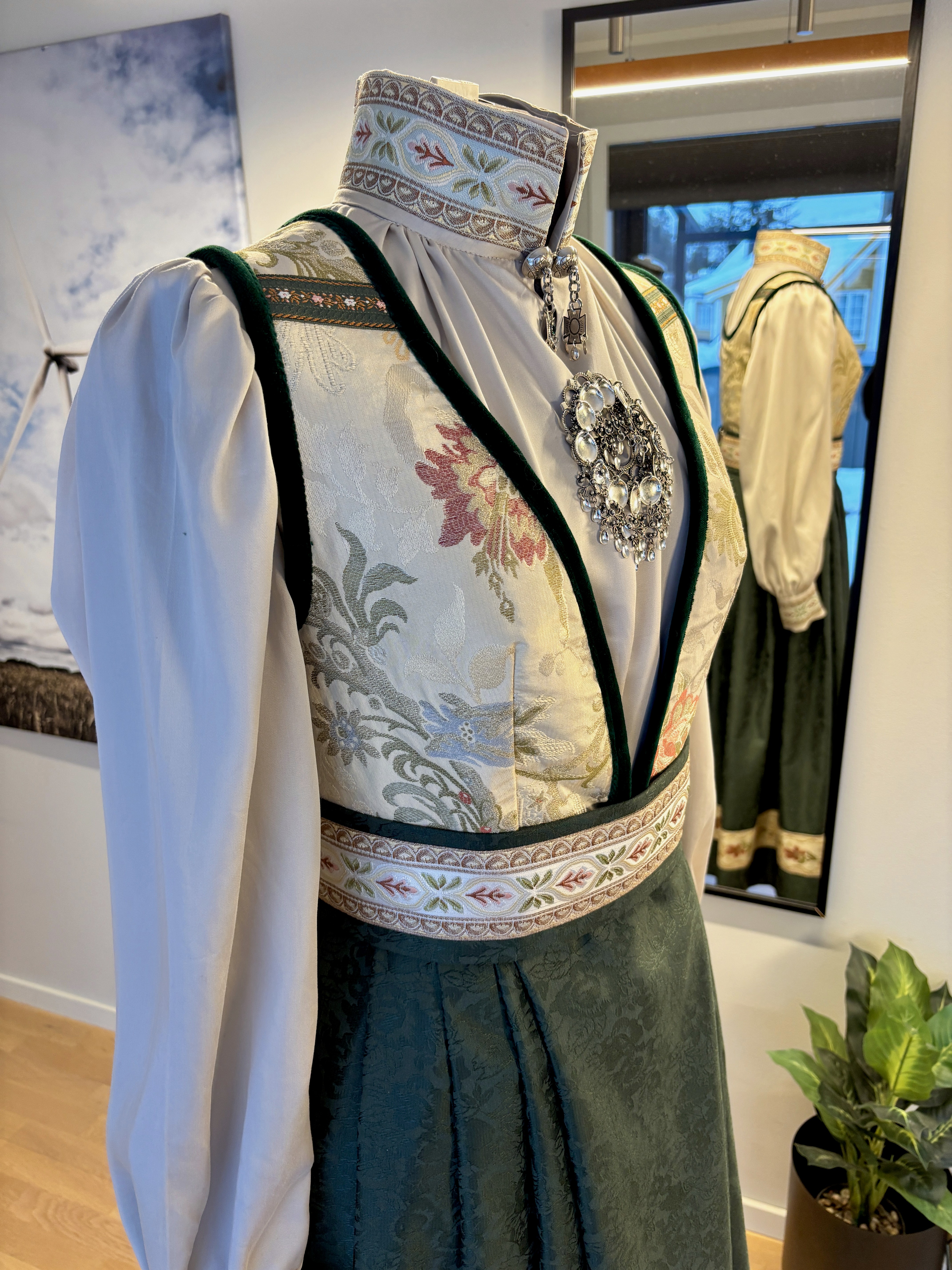 Feststakk med folder i livet. Stakk i mørkegrønn ulldamask og vest i en flott kremfarget silkebrokade med fløyelsbånd