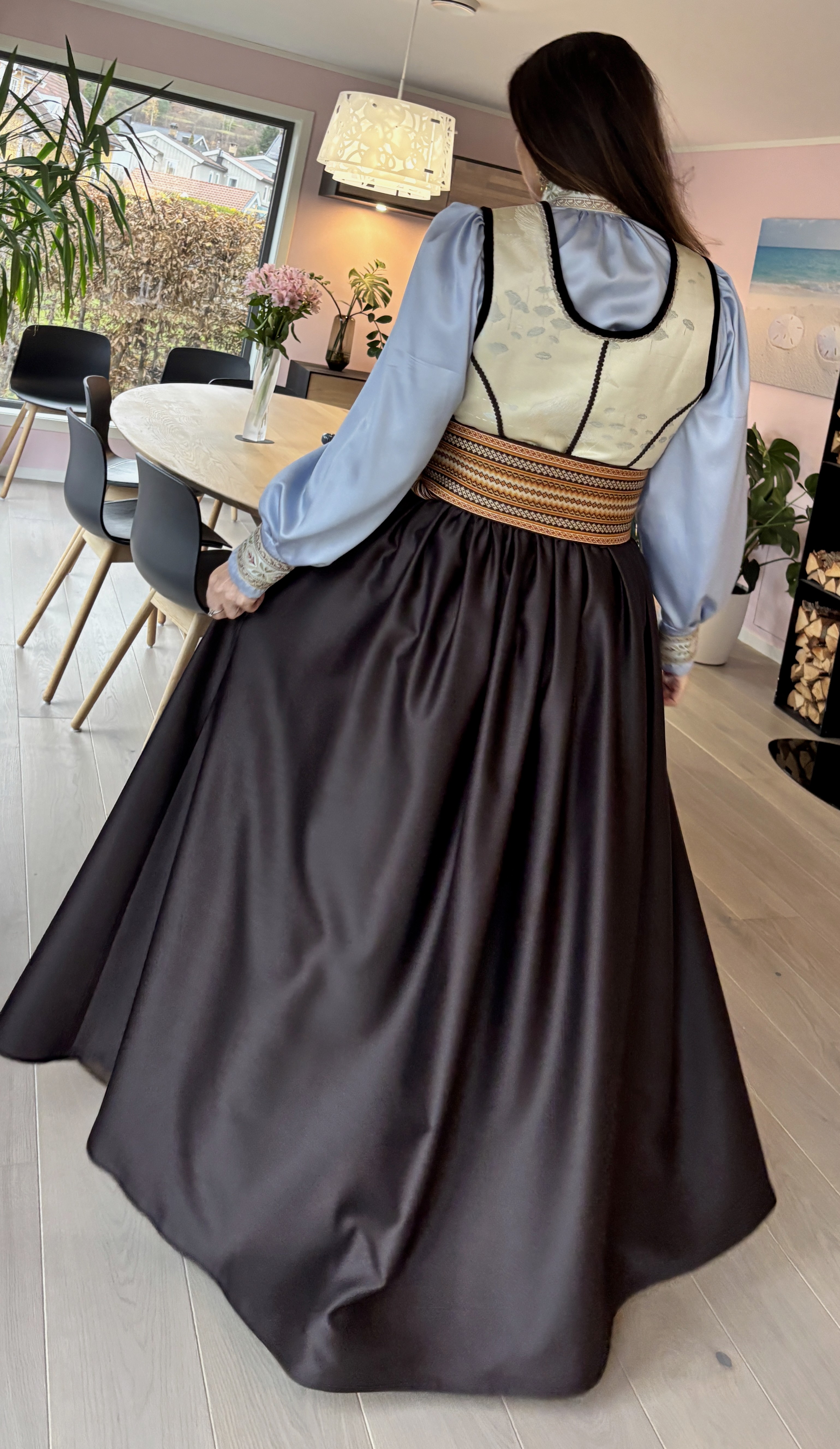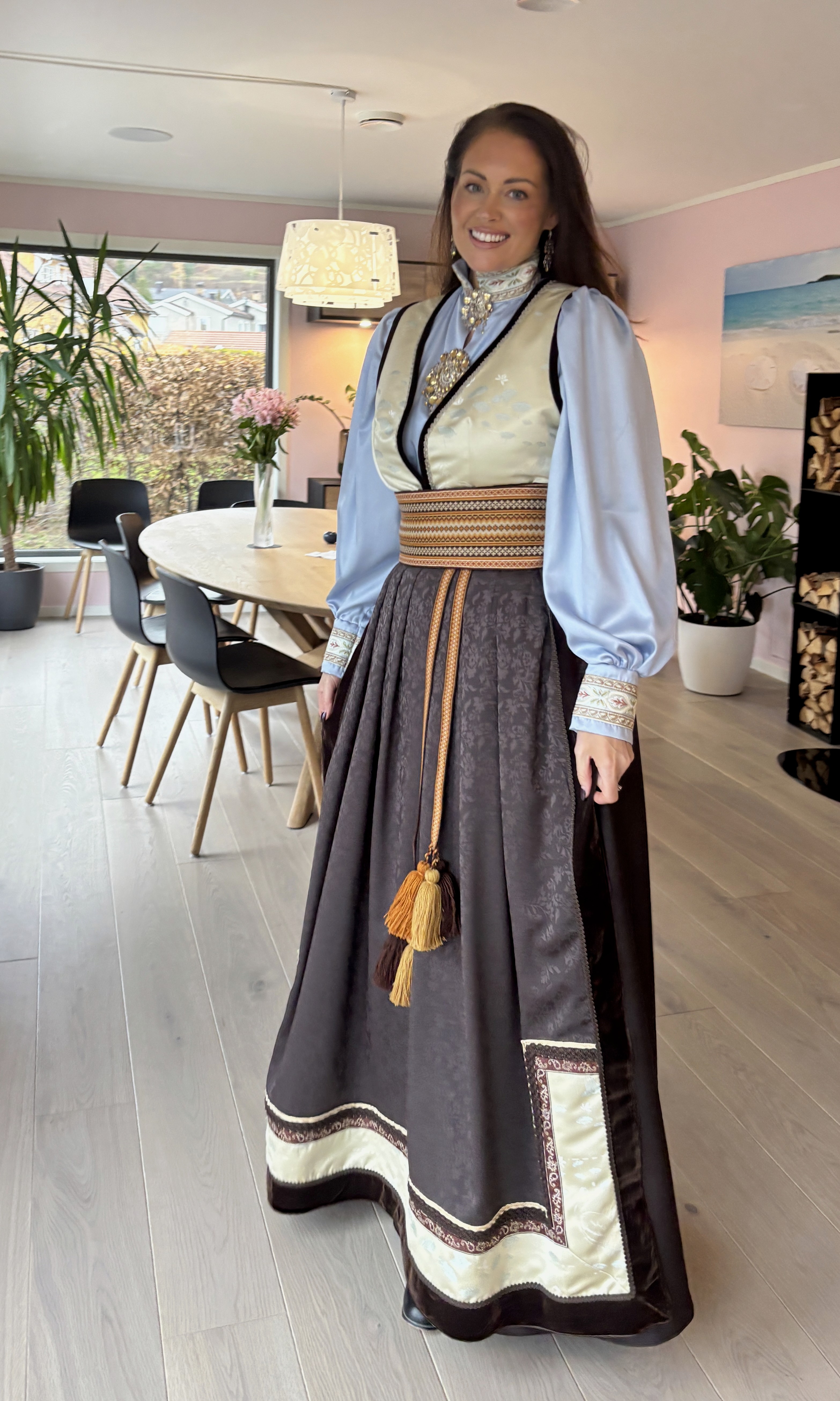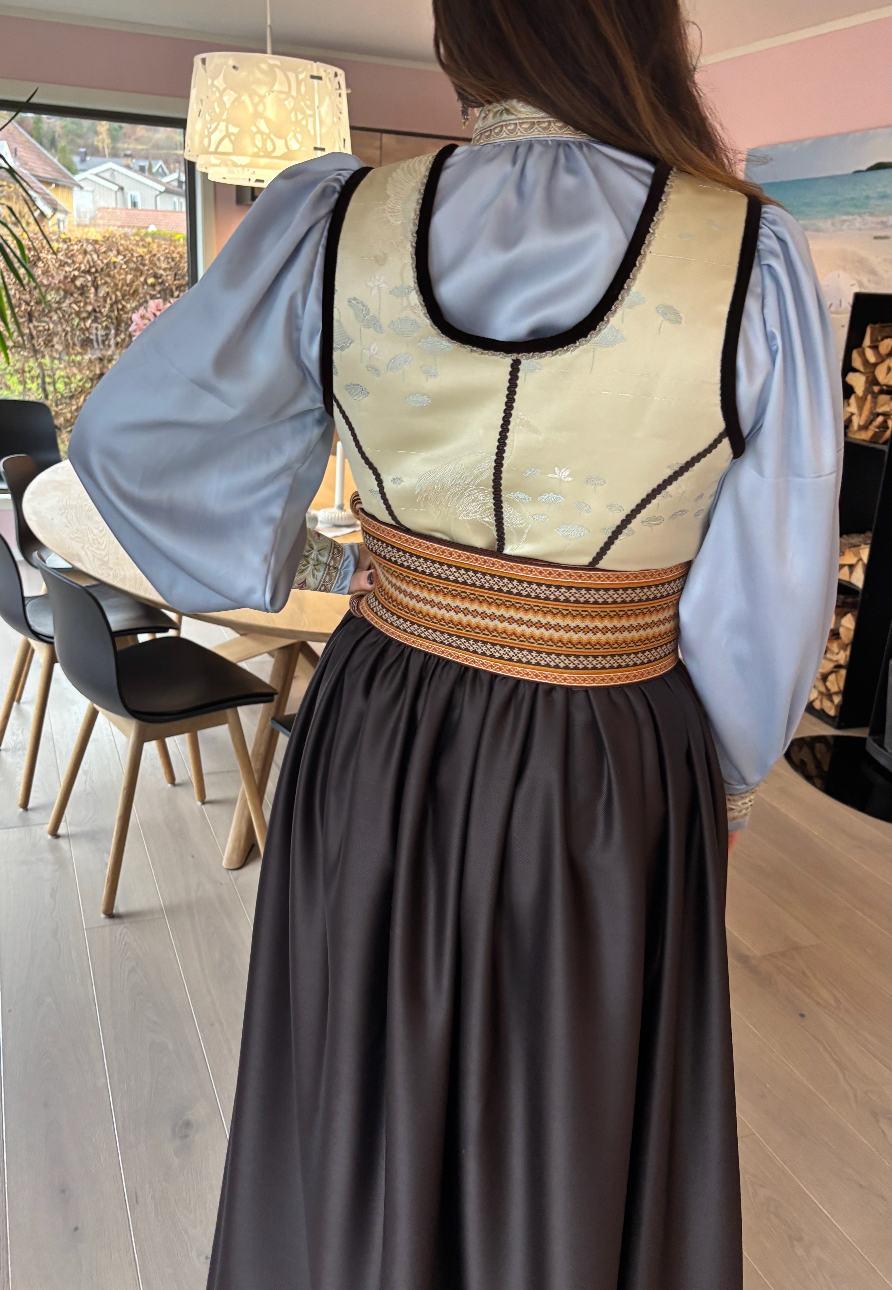 Feststakk med ekstra vidde i stakken. Stakken er sydd i nydelig sjokoladebrun ullsateng i 100% ull. Vest i en flott japanskinspirert viskosebrokade. Forkle i sjokoladebrun ulldamask med bånd i bruntoner og samme stoff som i vesten