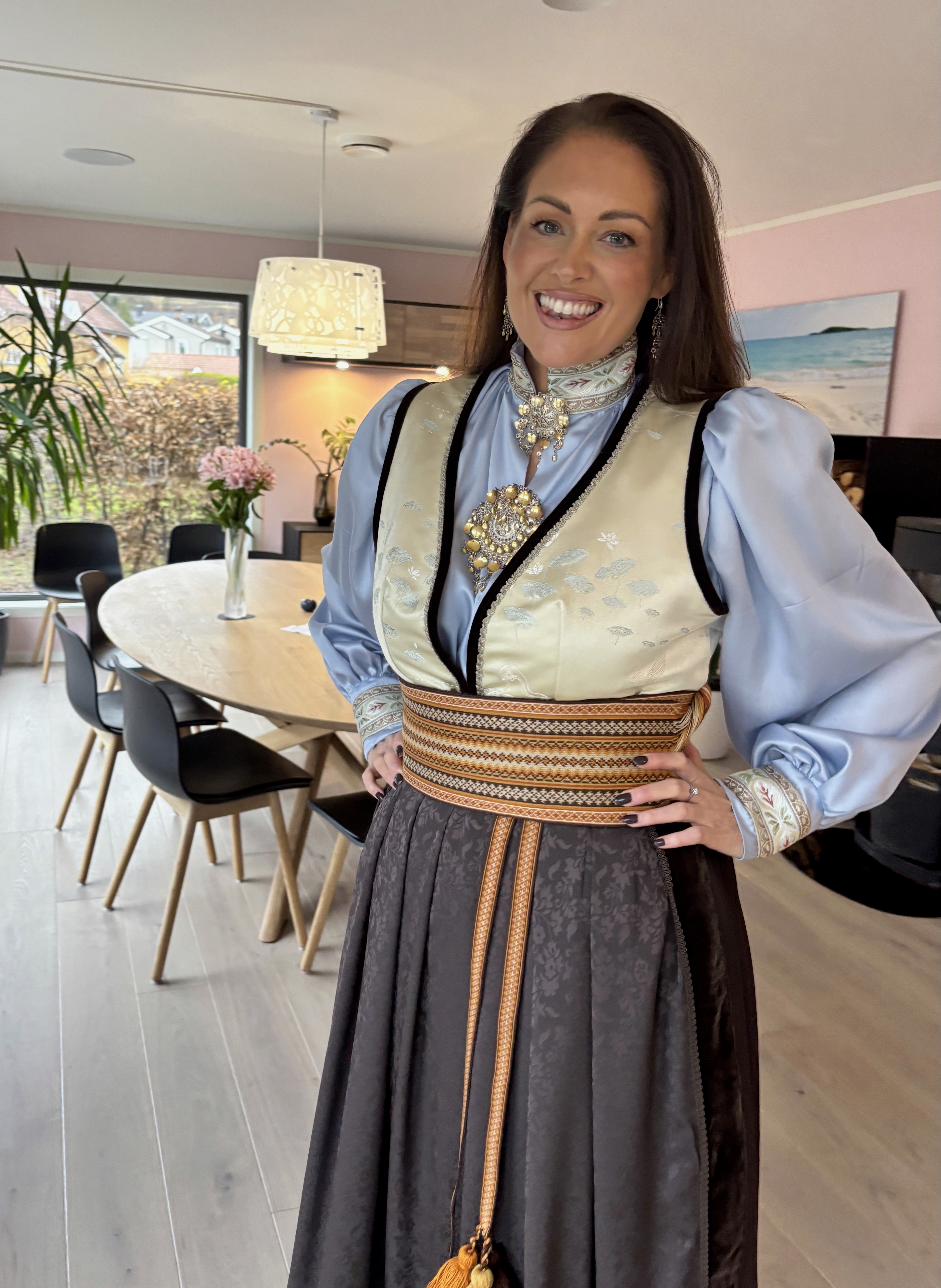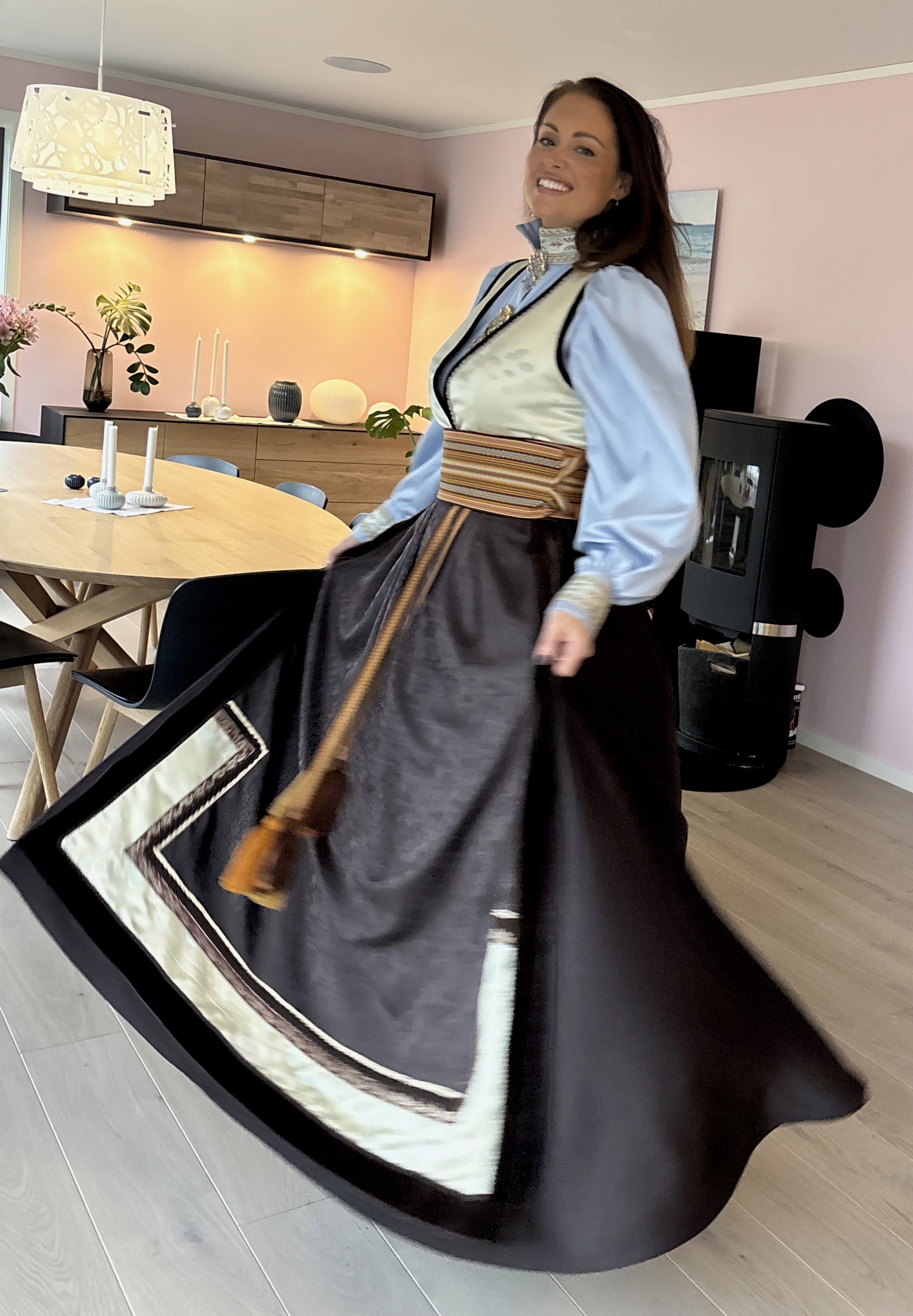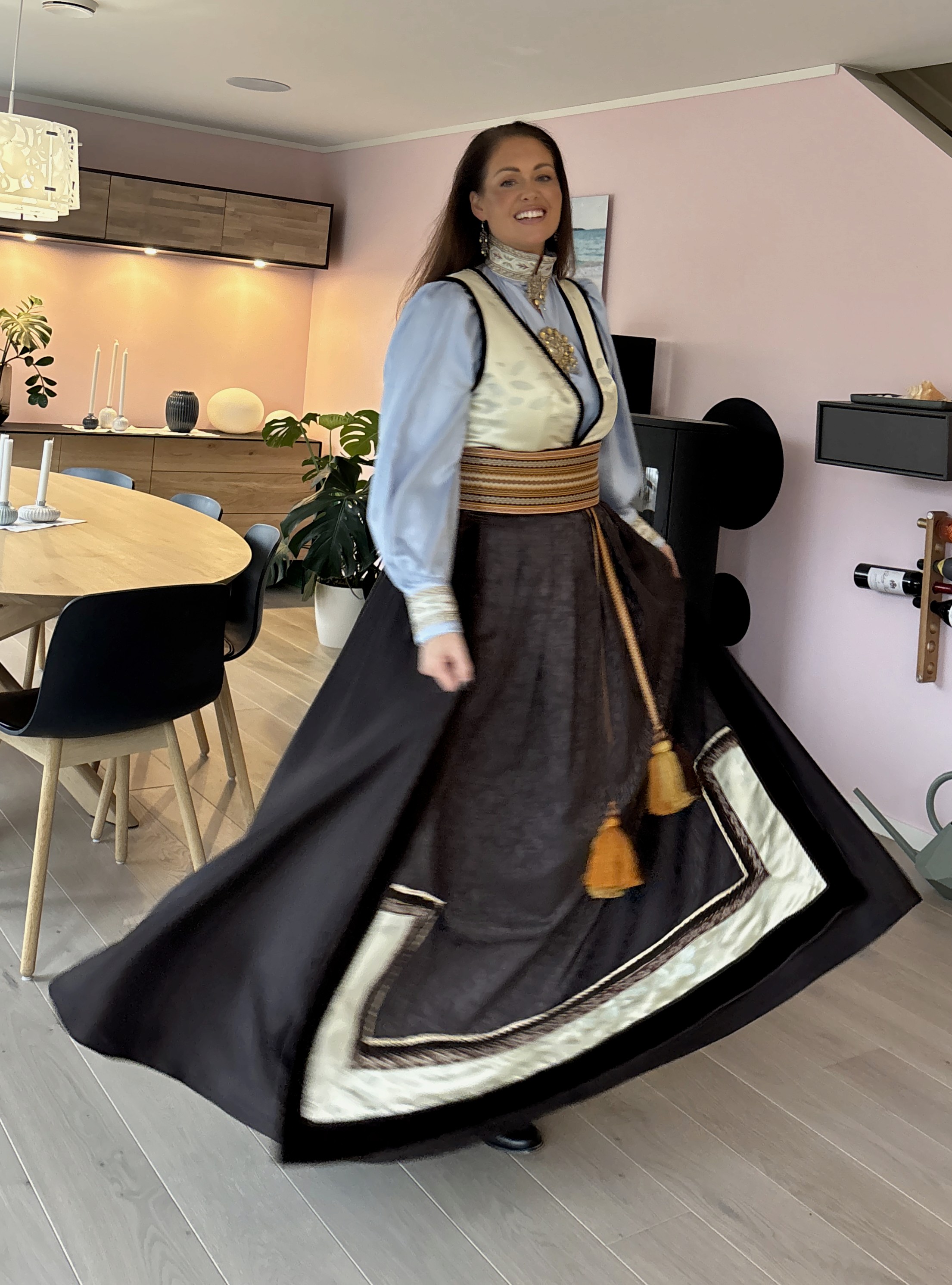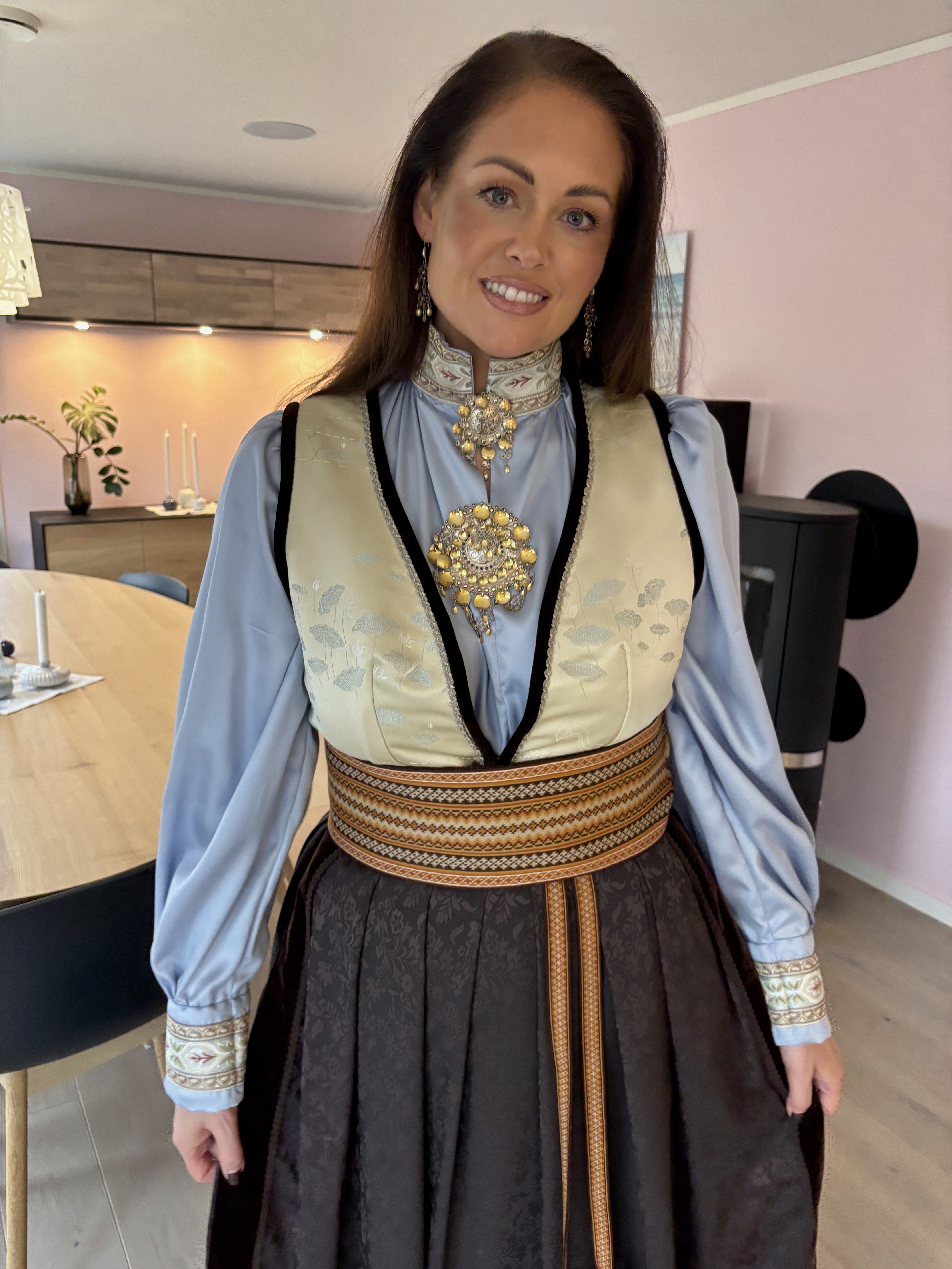 Feststakk med ekstra vidde i stakken. Stakken er sydd i nydelig sjokoladebrun ullsateng i 100% ull. Vest i en flott japanskinspirert viskosebrokade. Forkle i sjokoladebrun ulldamask med bånd i bruntoner og samme stoff som i vesten